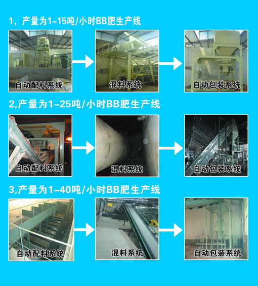 整条生产线由配料系统、混合装置、提升装置、高位料仓、定量包装秤、提辊式胶带输送机、自动缝包装置、生产线总控制柜组成,(10-40T )BB肥生产线具有配料精度高,配料速度快,每小时能配10T-40T,而且能随时打印报表和查询瞬间时配料准确情况,配料种类多,可适用于多种配料,各种物料的同事连续取料,提高了配料速度和精度,可以地面上料,运输方便快捷,操作安全,减少工人,多种规格,产量大,电脑控制,全自动化生产,搅拌均匀,停机后清理方便,适应性强,适合各种恶劣现场环境。